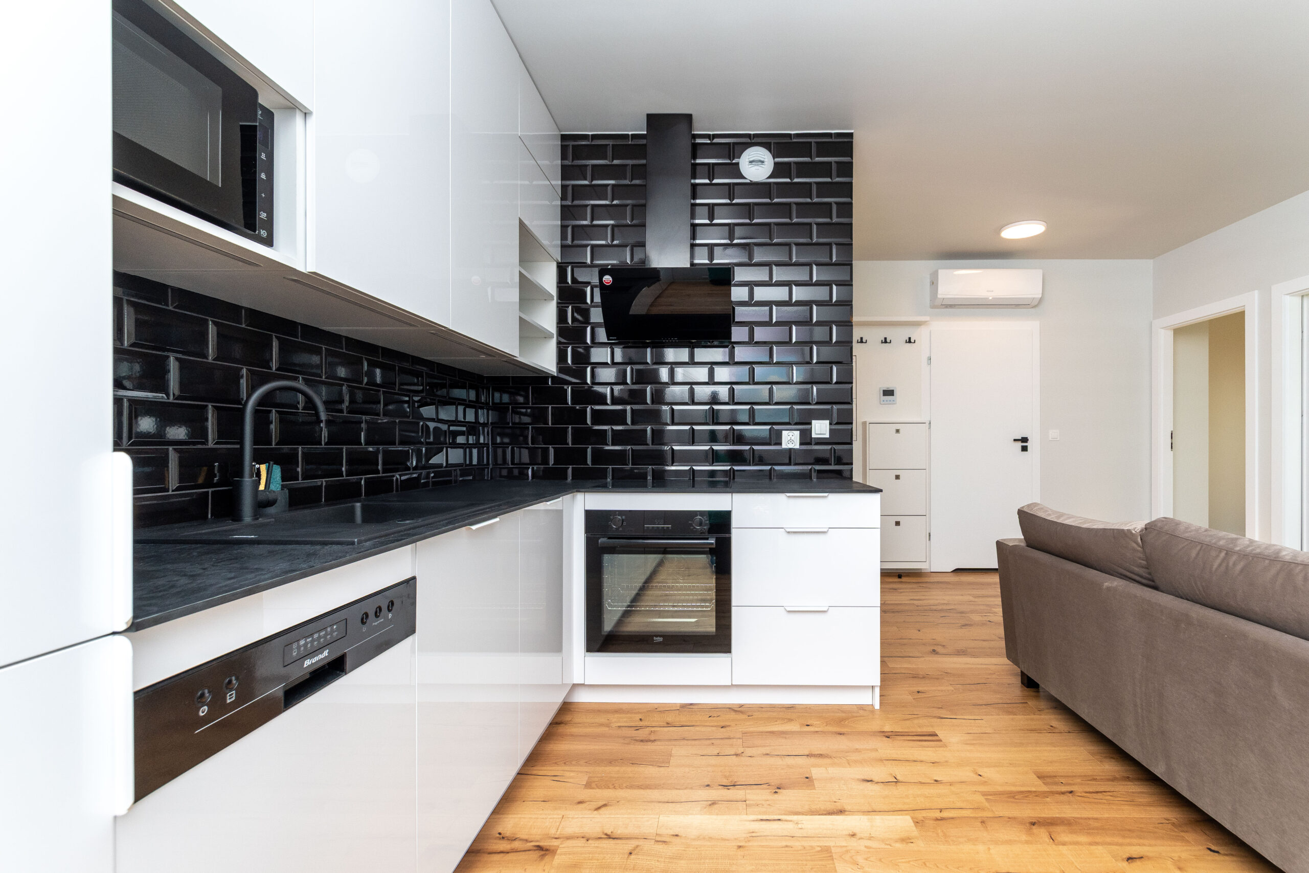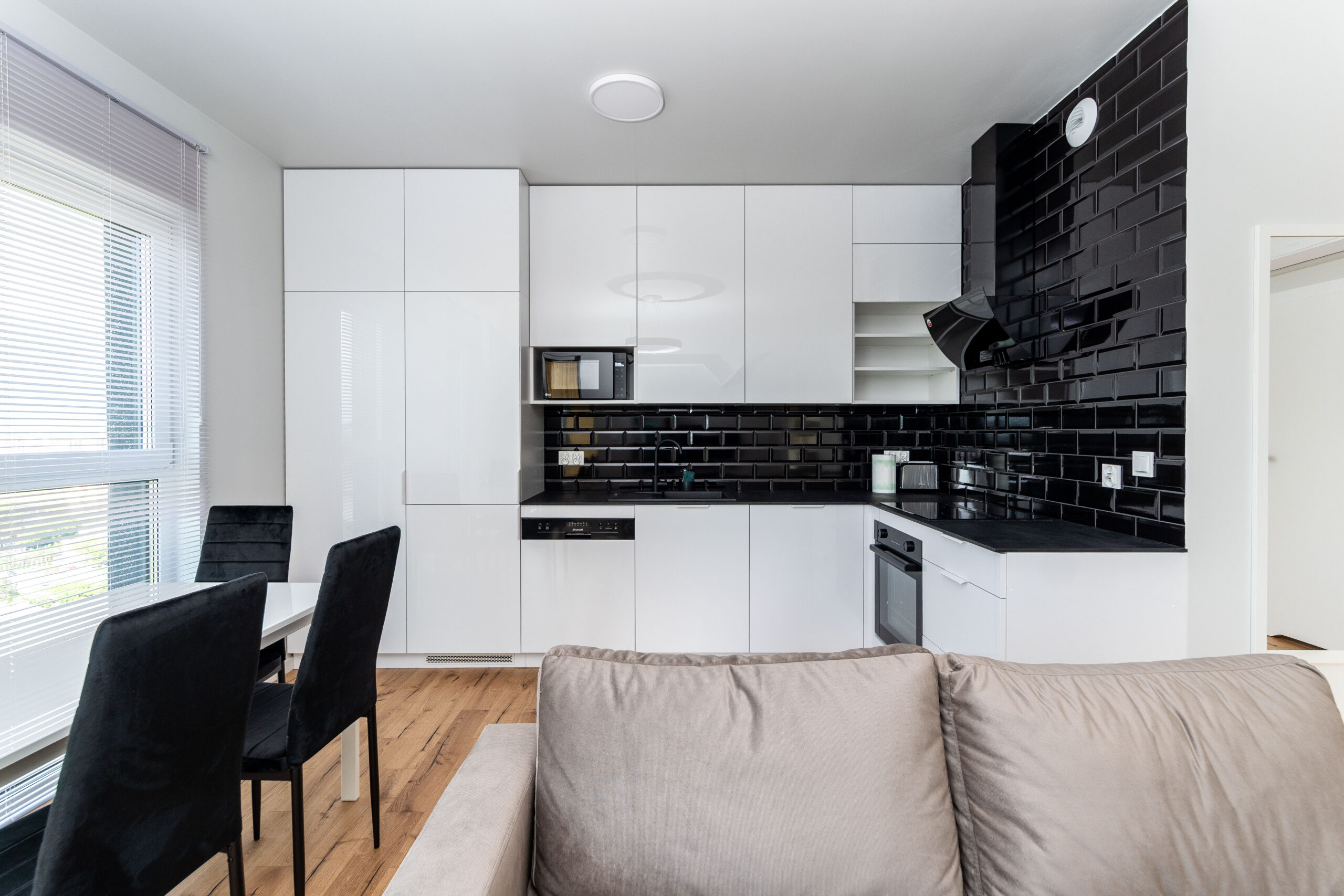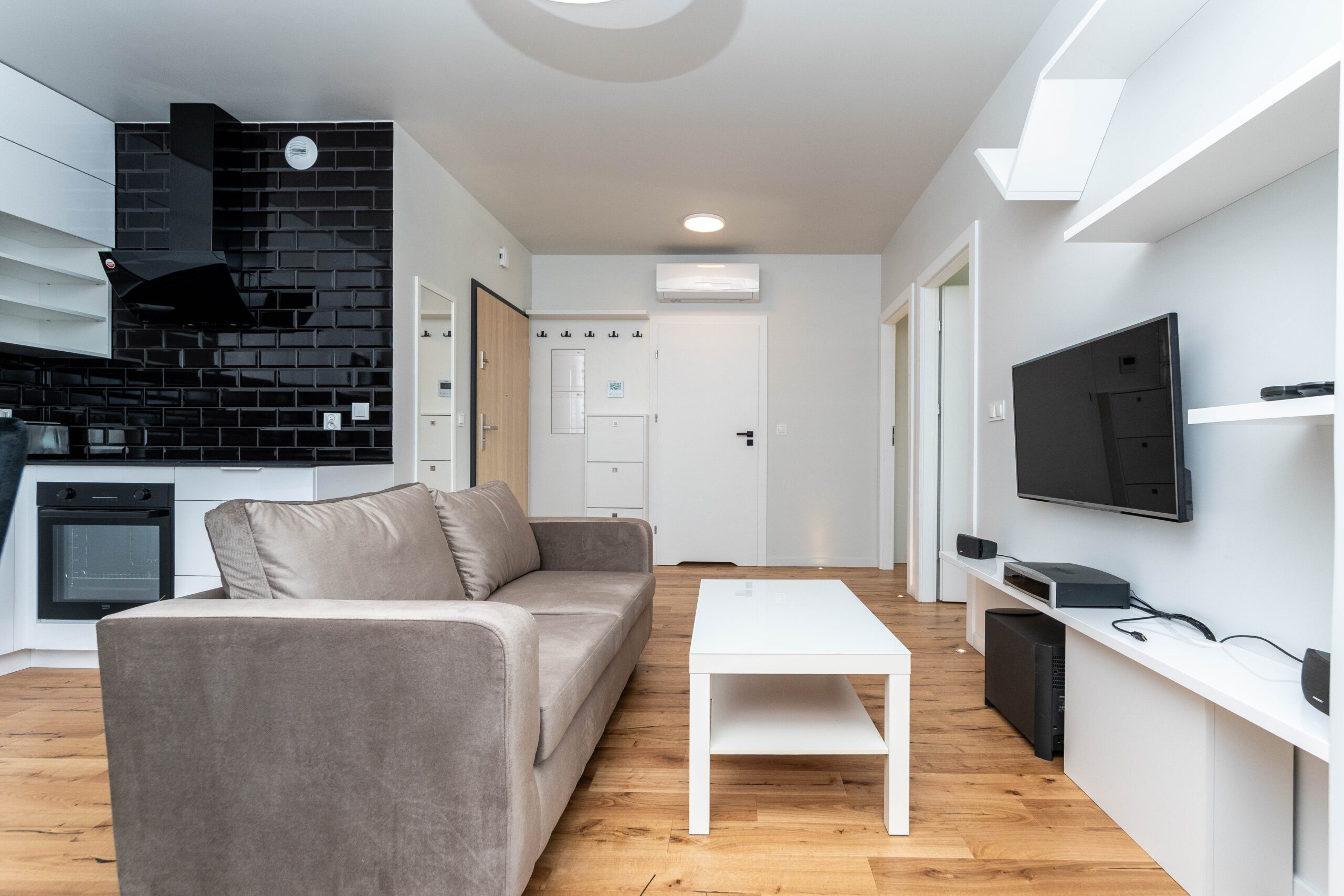 ➡️ 50 m2 – salon z aneksem kuchennym, 2 pokoje, łazienka.